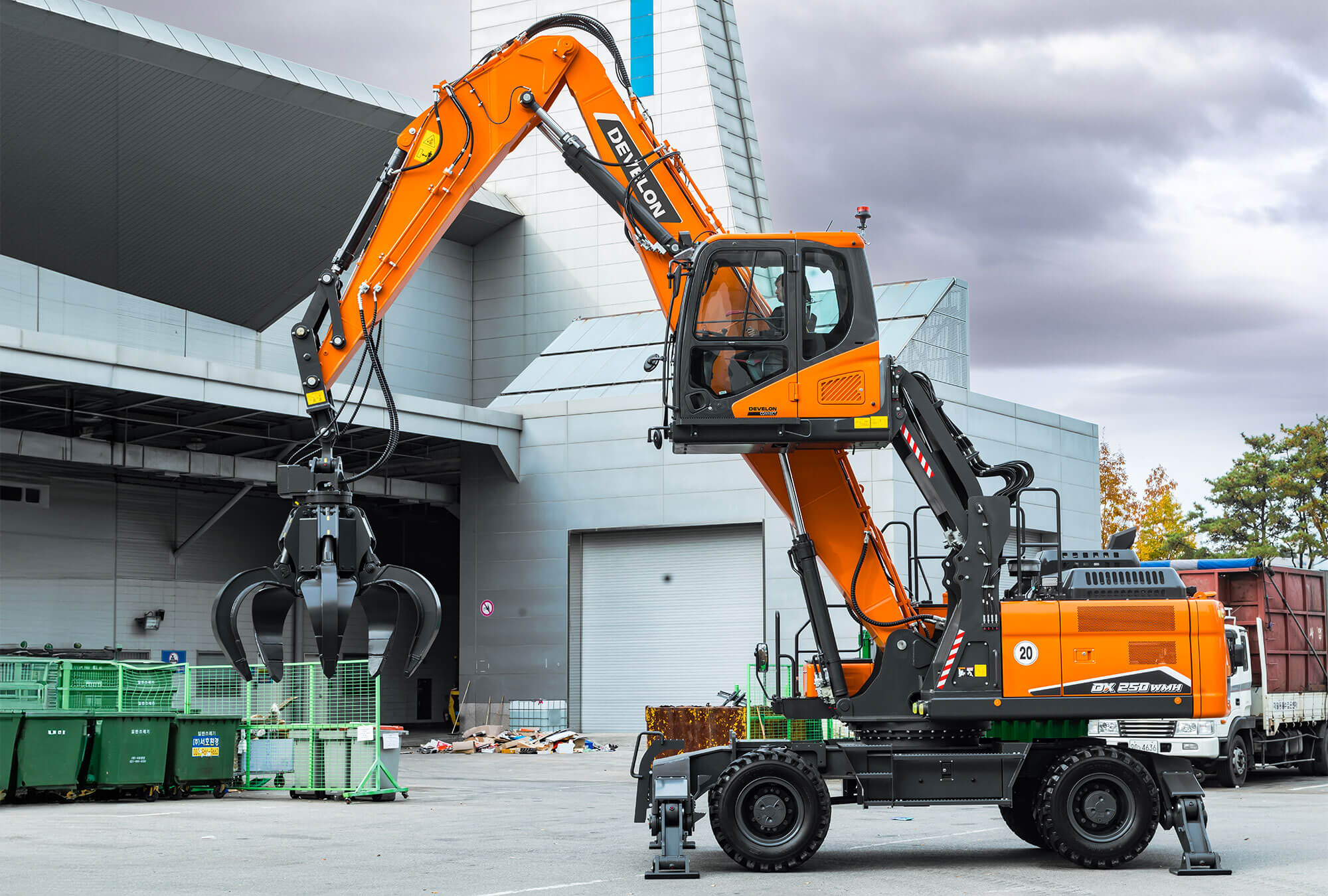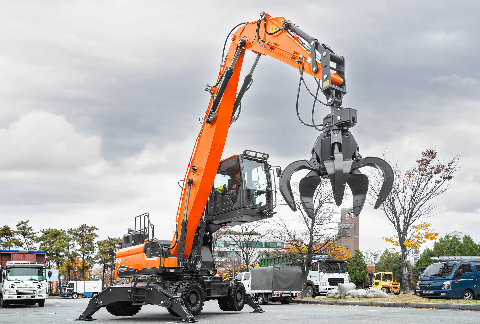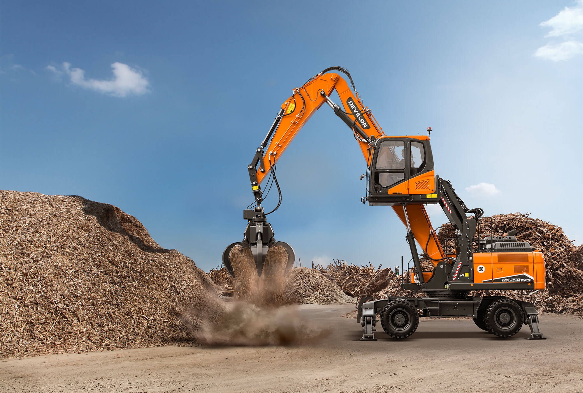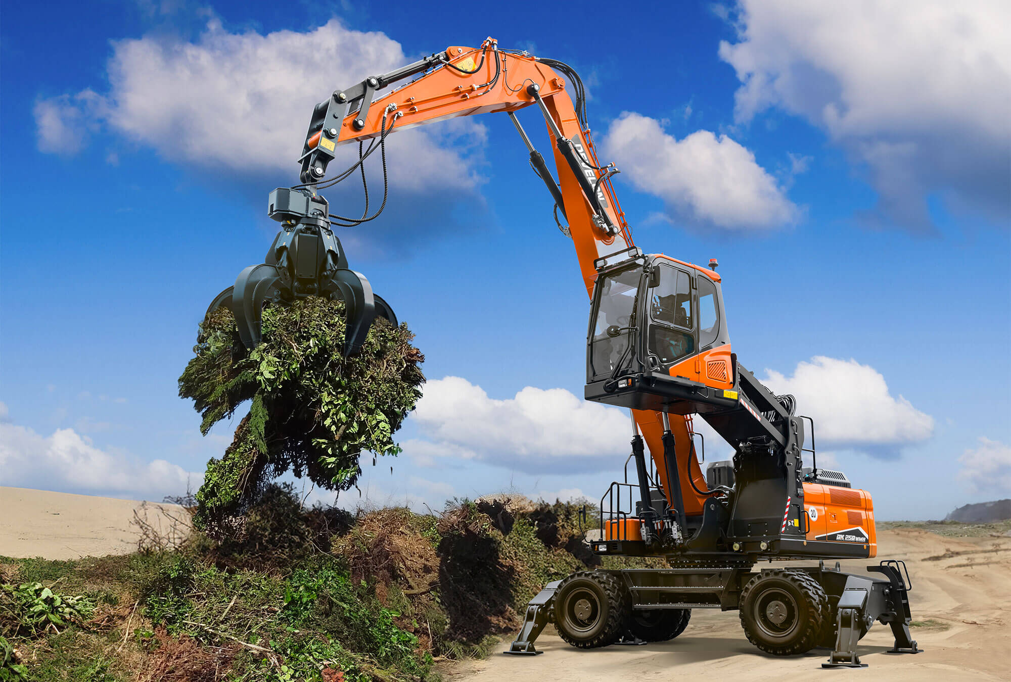 The DX250WMH-7 material handler has been designed specifically for a wide range of material sorting and handling applications such as those in the scrap metal and other solid waste and recycling industries, as well as logging. Designed to carry out the toughest tasks, the DX250WMH-7 is built with front and rear stabilizers, and a boom and arm specifically designed for material handling tasks. A standard feature is the hydraulic cab riser, which gives the operator better all-around visibility of the attachment and work area.