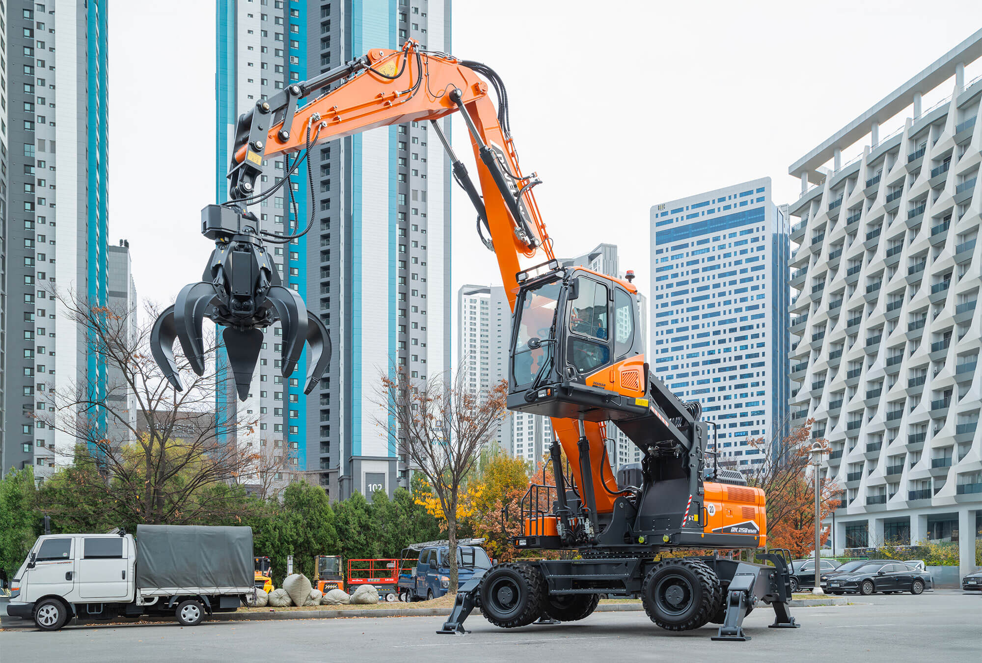 La pelle de manutention DX250WMH-7 a été spécialement conçue pour une grande variété d’applications de tri et de manutention de matériaux telles qu'en présentent les secteurs du traitement des métaux et autres déchets solides, du recyclage et de la production de bois. Conçue pour venir à bout des tâches les plus difficiles, la DX250WMH-7 est équipée de stabilisateurs avant et arrière, ainsi que d’une flèche et d’un balancier spécifiquement conçus pour la manutention de matériaux. Elle est dotée de série d’une cabine relevable hydraulique, qui offre à l’opérateur une visibilité accrue sur l’accessoire et la zone de travail.