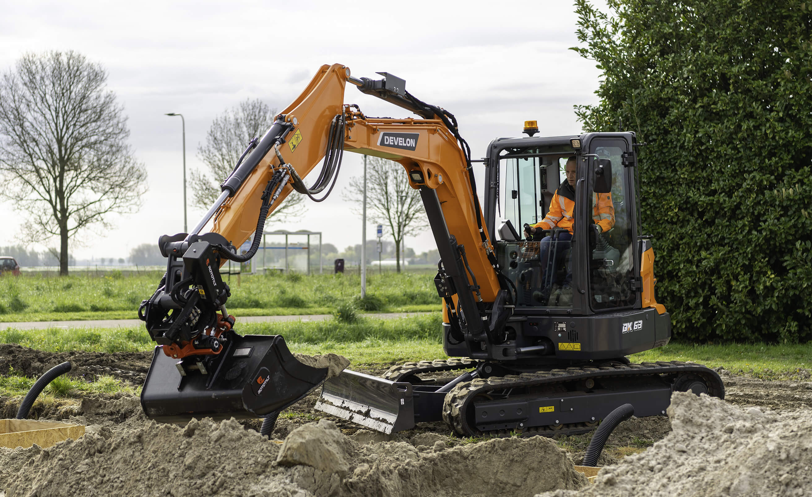 Il DX63-7 è dotato di una nuova cabina e numerose caratteristiche per garantire efficienza e comfort dell'operatore. Develon Smart Touch facilita controllo, monitoraggio e risoluzione dei guasti.